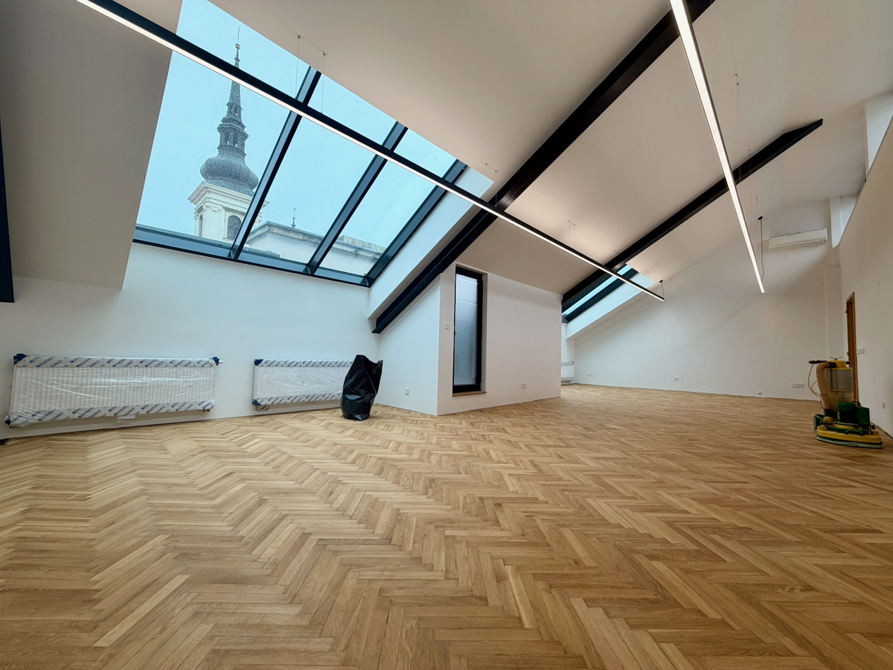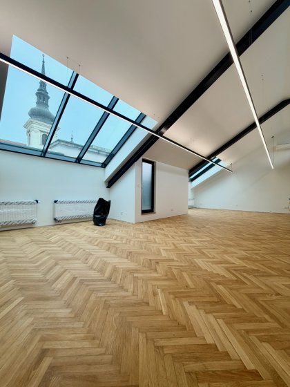 Openspace kancelář s velkoformátovými okny s výhledem na kostel sv. Tomáše. Součástí prostor je výjimečná panoramatická střešní terasa s výhledy na Moravské náměstí.
