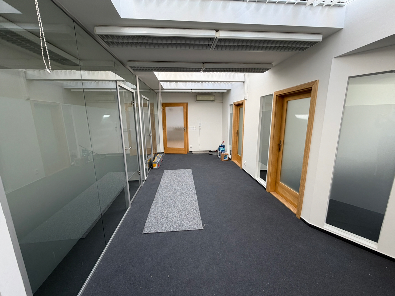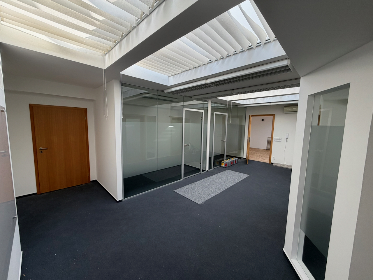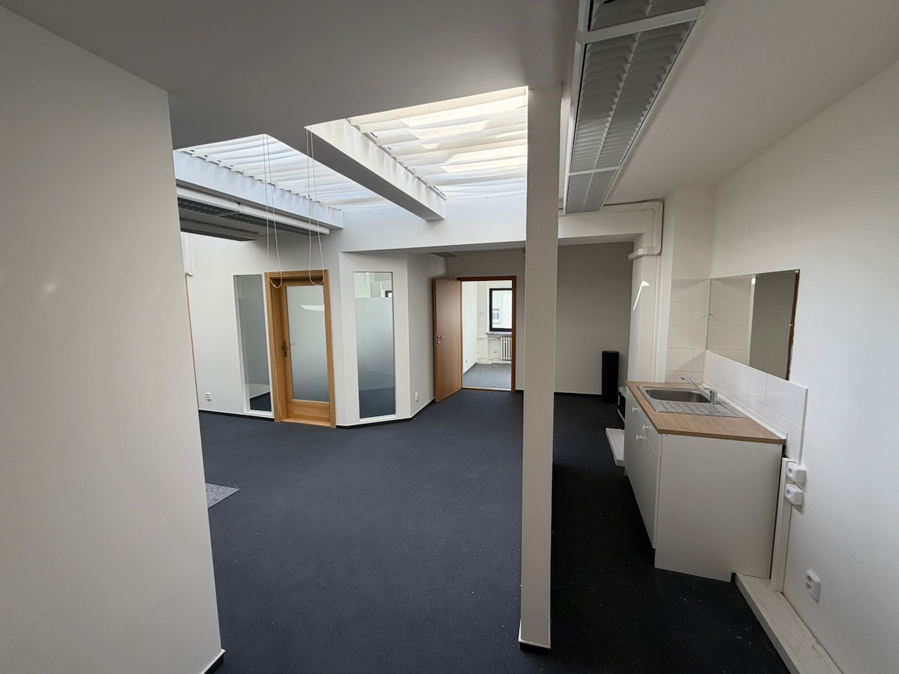 Druhá velká kancleář je rozčleněna na 5 samostatných menších kanceláří různých velikostí pro komornější využití.